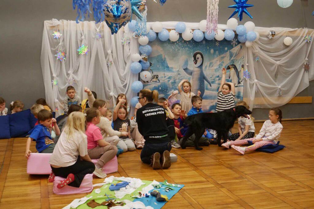 Dzieci z ogromnym zaangażowaniem tworzyły swoje przytulanki ze skarpet, pokazując, że wyobraźnia naprawdę nie zna granic. Wspólnie rozmawialiśmy także o tym, jak ważne w codziennym życiu są bliskość, czułość i dobre słowo – bo nawet najmniejszy gest może mieć wielką moc. Wyjątkowym momentem była wizyta niezwykłego gościa – suczki Coli, która razem ze swoją właścicielką Marzeną Polak opowiedziała i pokazała, jak właściwie postępować z psami, jak odczytywać ich sygnały oraz budować relację opartą na zaufaniu i bezpieczeństwie. Dzieci miały również okazję zobaczyć w praktyce, jak działa mata węchowa i z jakim zaangażowaniem pies potrafi pracować nosem. To było piękne, mądre i pełne dobrej energii zakończenie zimowego wypoczynku. Serdecznie dziękujemy wszystkim dzieciom za obecność, entuzjazm i wspaniałą atmosferę, a instruktorom za profesjonalizm, serce włożone w przygotowanie zajęć oraz troskę o każdy szczegół. Do zobaczenia podczas kolejnych wspólnych wydarzeń!