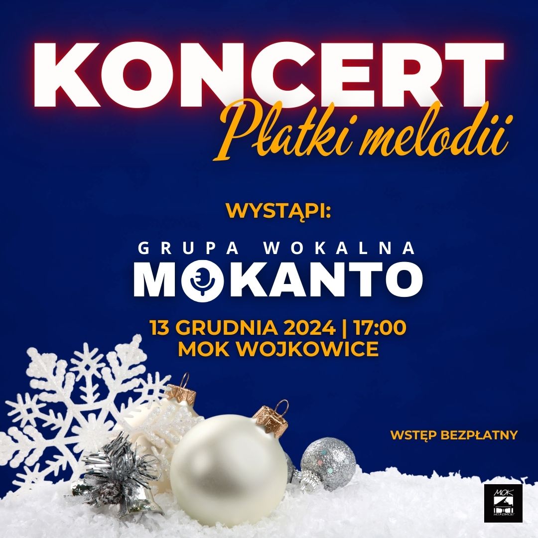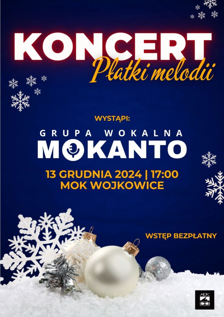 Miejski Ośrodek Kultury w Wojkowicach z radością zaprasza na wyjątkowy koncert w wykonaniu grupy wokalnej MOKanto! Młodzi, utalentowani wokaliści przeniosą nas w magiczny świat piosenek zimowych oraz świątecznych. Koncert odbędzie się 13 grudnia o godz. 17:00. Wstęp na to niezwykłe wydarzenie jest wolny, więc nie przegapcie tej okazji!