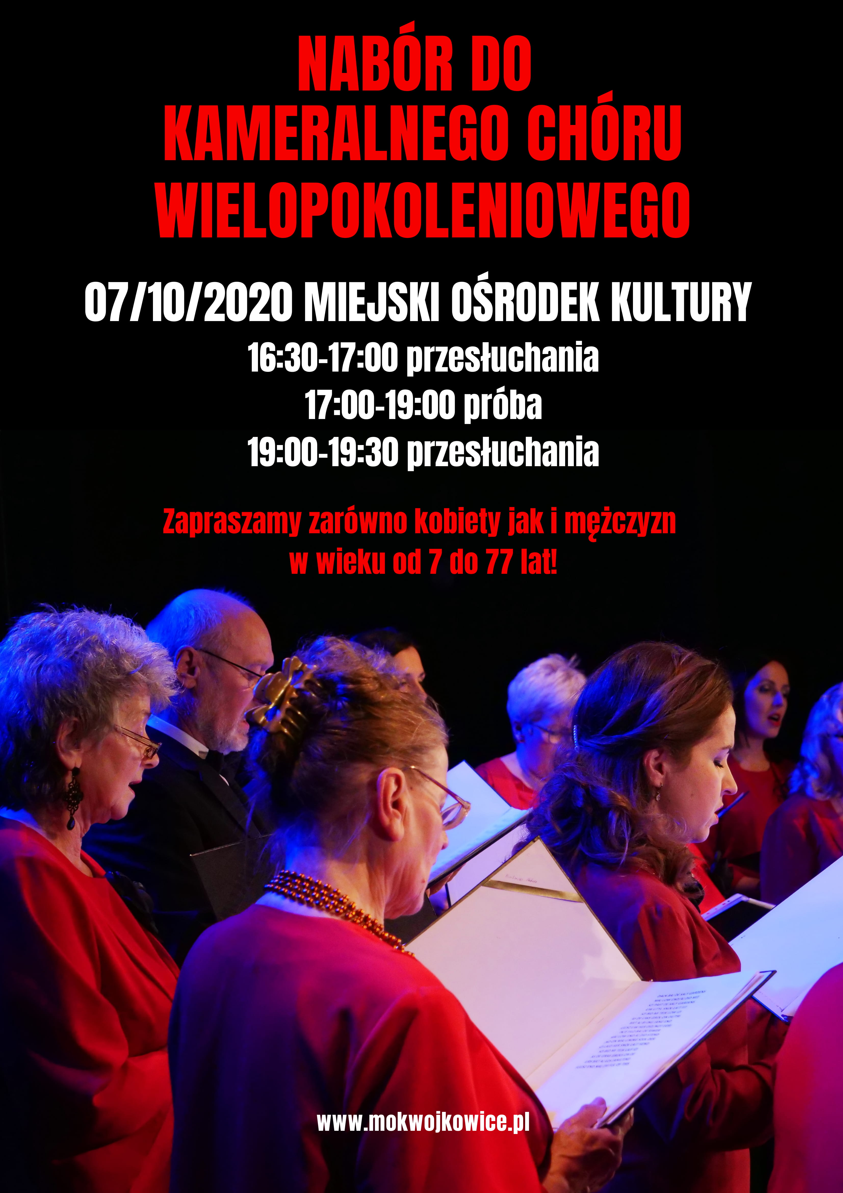 Organizatorzy zapraszają chętnych na pierwsze spotkanie połączone z przesłuchaniami już 7 października. Pierwsze przesłuchania odbędą się od 16.30 do 17.00, a następnie do godziny 19.00 będą miały miejsce próby. Kolejne przesłuchania zostały wyznaczone na godzinę 19.00 do 19.30. Zachęcamy mężczyzn i kobiety a także dzieci do zapoznania się z działaniami grupy, wypróbowania własnych sił na spotkaniu z uczestnikami zajęć i prowadzącymi. Chór to przede wszystkim integracja, praca nad emisją głosu, przełamywanie barier i doskonalenie warsztatu wokalnego. Udział w zajęciach i systematyczne ćwiczenia dają również możliwość występów podczas uroczystości i okolicznościowych wydarzeń organizowanych przez Miejski Ośrodek Kultury w Wojkowicach.
